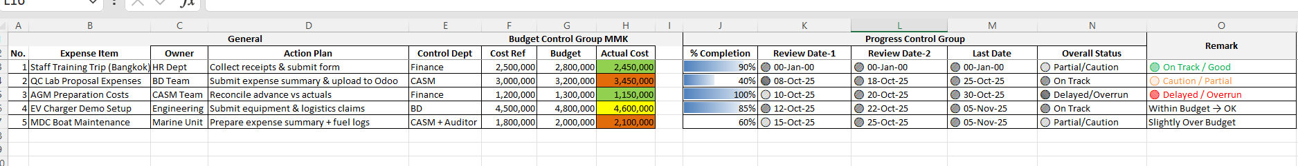 No. | Expense Item | Owner | Action Plan | Control Dept | Cost Ref (USD/MMK) | Budget (USD/MMK) | Actual Cost (USD/MMK) | % Completion | Progress Bar | Review Date-1 | Review Date-2 | Last Date | Overall Status (Color) | Remark |